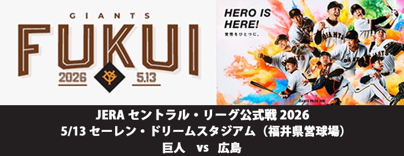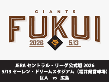 ♦JERA セントラル・リーグ公式戦 2026「巨人-広島」(5月13日:セーレン・ドリームスタジアム(福井県営球場))→3月7日正午から9日正午まで先行抽選販売(読者会員)、3月14日午前10時から一般販売